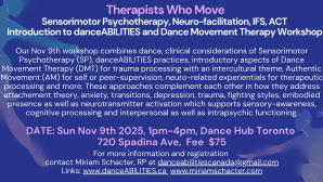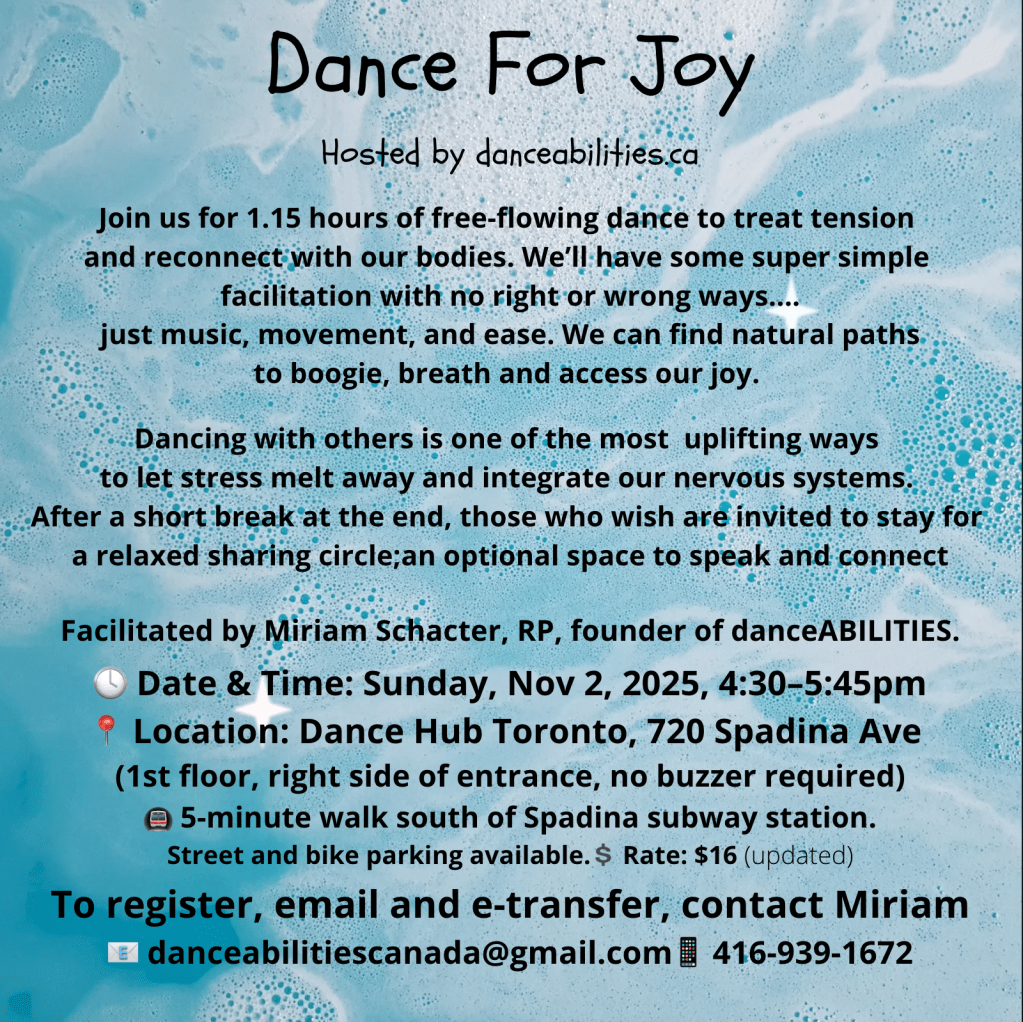 DATE: Sunday Nov 9th 2025 TIME: 1pm – 4pm LOCATION: 720 Spadina, “Dance Hub Toronto” Ontario, Canada. FEE $75 for 3-hour workshop, no HST. Facilitated by Miriam Schacter, RP founder of danceABILITIES™ REGISTRATION: To register, ask questions or share ideas, please contact: danceabilitiescanada@gmail.com.